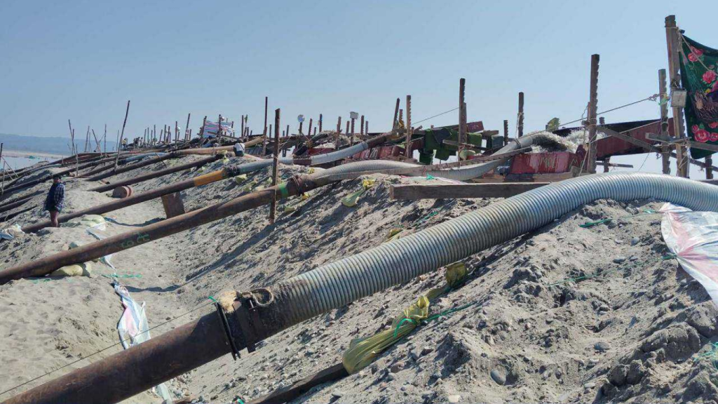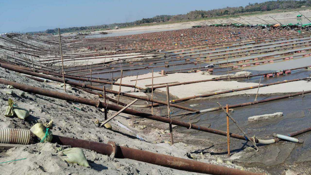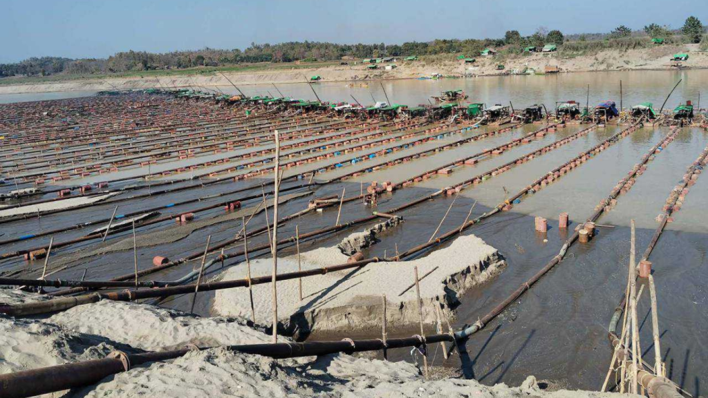 ယခင်က သူ့စိုက်ခင်းနေရာတွင် ဖောင်တွဲနှင့် ပိုက်များ အစီအရီ တန်းစီချထားသည်။ မျောဖောင်များက ချင်းတွင်းမြစ်အတွင်း ပျံ့နှံ့လျက် တဂျုံးဂျုံးတဂျက်ဂျက်နှင့် စက်ယန္တရားအသံများပါ ဆူညံနေသည်။