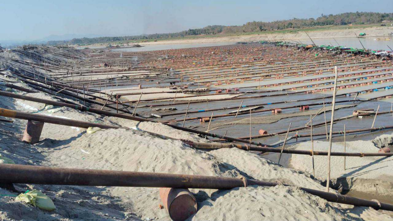 ယခင်က သူ့စိုက်ခင်းနေရာတွင် ဖောင်တွဲနှင့် ပိုက်များ အစီအရီ တန်းစီချထားသည်။ မျောဖောင်များက ချင်းတွင်းမြစ်အတွင်း ပျံ့နှံ့လျက် တဂျုံးဂျုံးတဂျက်ဂျက်နှင့် စက်ယန္တရားအသံများပါ ဆူညံနေသည်။