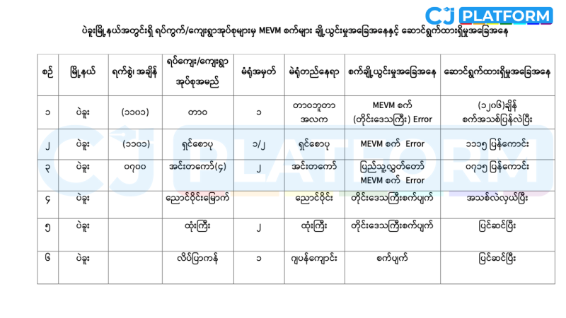 ပြီးခဲ့တဲ့ ဒီဇင်ဘာ ၂၈ရက်နေ့က ကျင်းပခဲ့တဲ့ စစ်အုပ်စုရဲ့ အတုယောင်ရွေးကောက်ပွဲ ပထမပိုင်းနဲ့ ဇန်နဝါရီ ၁၁ရက်နေ့မှာ ကျင်းပခဲ့တဲ့ ဒုတိယပိုင်းတွေမှာ စစ်အုပ်စုက ထုတ်လုပ်ထားတဲ့ မြန်မာအီလက်ထရောနစ်မဲပေးစက် ( Myanmar Electronic Voting Machine – MEVM ) တွေဟာ ချို့ယွင်းချက်တွေ ဖြစ်ပေါ်ခဲ့တယ်လို့ သတင်းတွေ ထွက်ပေါ်ခဲ့ပေမယ့် စစ်အုပ်စုရဲ့ ရွေးကောက်ပွဲကော်မရှင်ကတော့ မဲပေးစက်ချို့ယွင်းမှုတွေကို အတိကျ ထုတ်ပြန်ထားတာ မရှိခဲ့ပါဘူး။