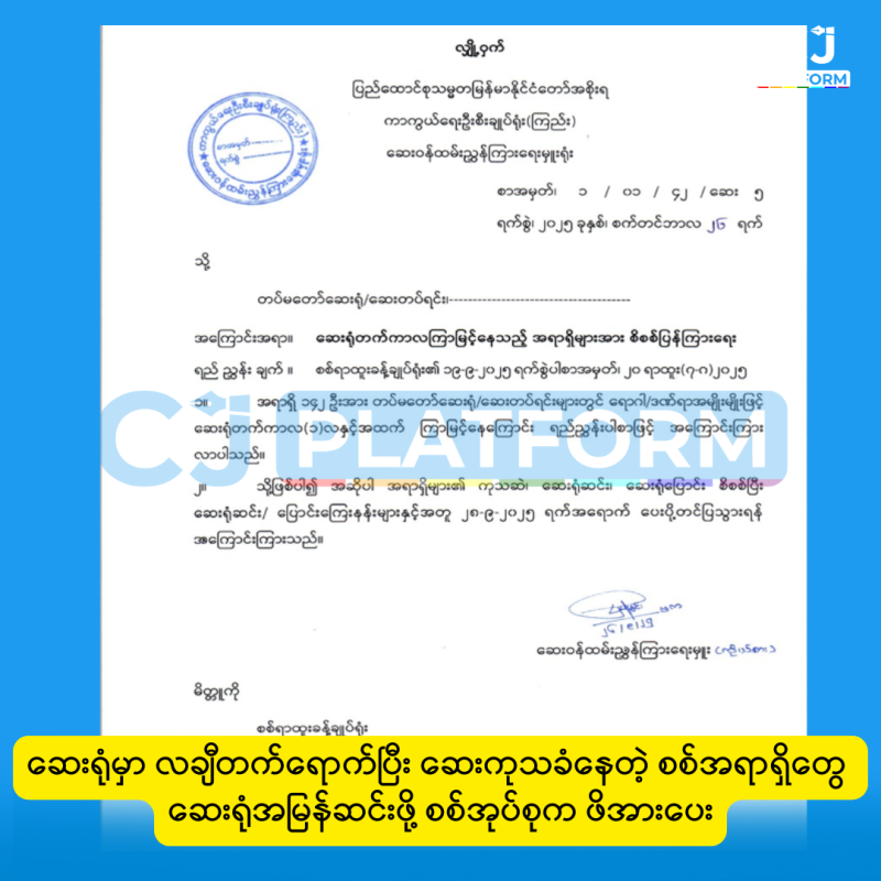 စစ်ဆေးရုံတွေမှာ လချီတက်ရောက်ပြီး ဆေးကုသခံနေတဲ့ စစ်အုပ်စုလက်အောက်ခံ ဗိုလ်မှူးကြီး၊ ဒုဗိုလ်မှူးကြီး၊ ဗိုလ်မှူး၊ ဗိုလ်ကြီးနဲ့ ဗိုလ်တွေကို ဆေးရုံကနေ အမြန်ဆုံးဆင်းဖို့ စစ်အုပ်စုရဲ့ ဆေးဝန်ထမ်းညွှန်ကြားရေးမှူးရုံးကနေ ဖိအားပေးကာ ဆေးရုံဆင်းဖို့နဲ့ ဆေးရုံပြောင်းရွှေ့ခိုင်းတဲ့ လျှို့ဝှက်ညွှန်ကြားစာတစ်စောင်ကို CJ Platform က လက်ခံရရှိထားပါတယ်။