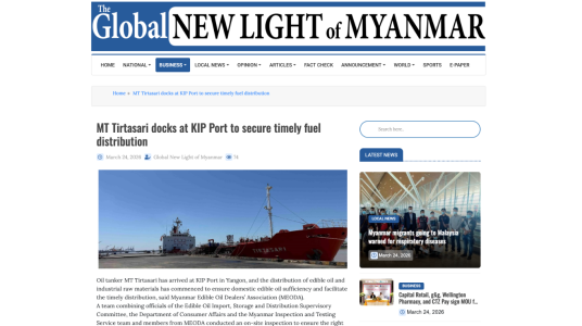 စားသုံးဆီ တင်ဆောင်လာတဲ့ MT TIRTASARI သင်္ဘောတစ်စင်း မတ် ၂၁ ရက်...